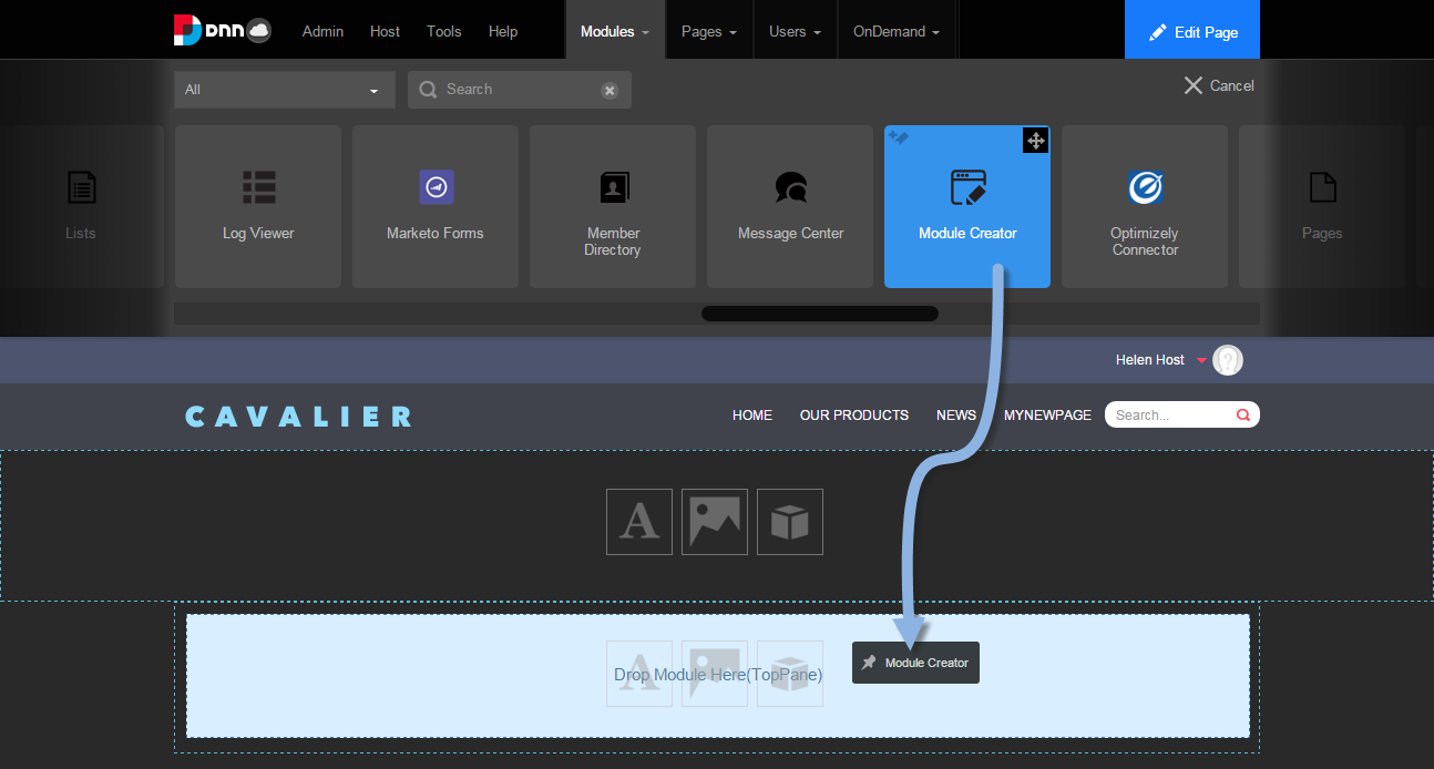 4. Drag the Module Creator module to any pane on the webpage.