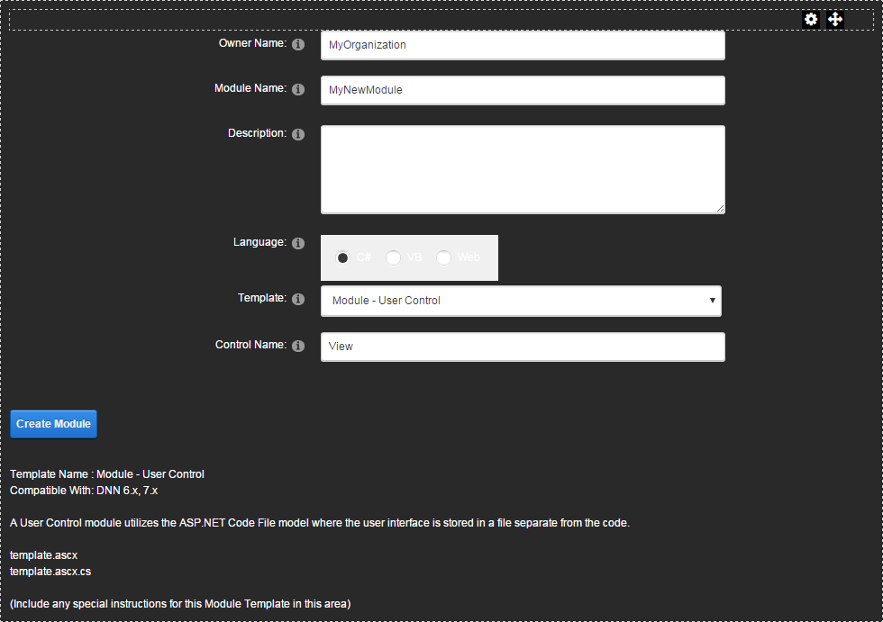 The DNN Module Creator enables developers to quickly build modules without a full-blown IDE, like Visual Studio. It automates many of the initial module creation tasks so that module developers can focus on writing code. In addition, the Module Creator can be extended with custom templates to further streamline development.