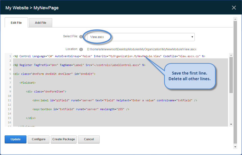 2. In the View.ascx file, delete all the lines of code, except the first one.
