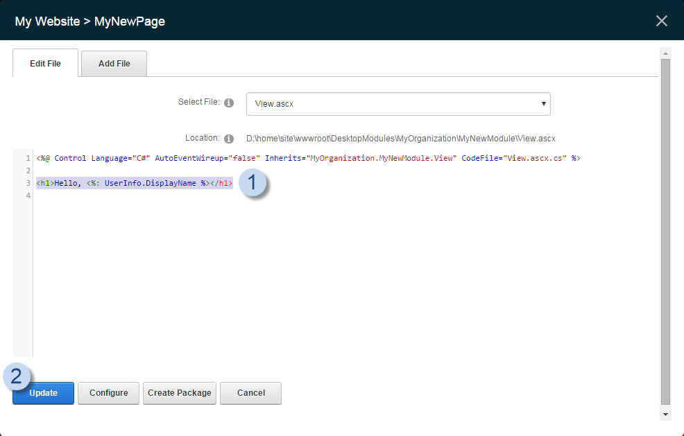 3. Add markup to customize the module, then click Update to save your changes.
