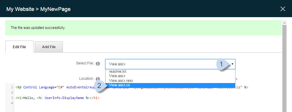 4. From the Select File dropdown, choose the View.ascx.cs file.