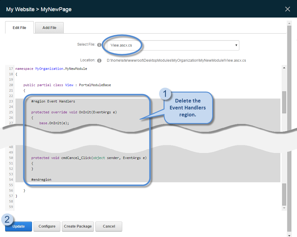 5. Remove all the code in the Event Handlers region and click Update to save your changes.